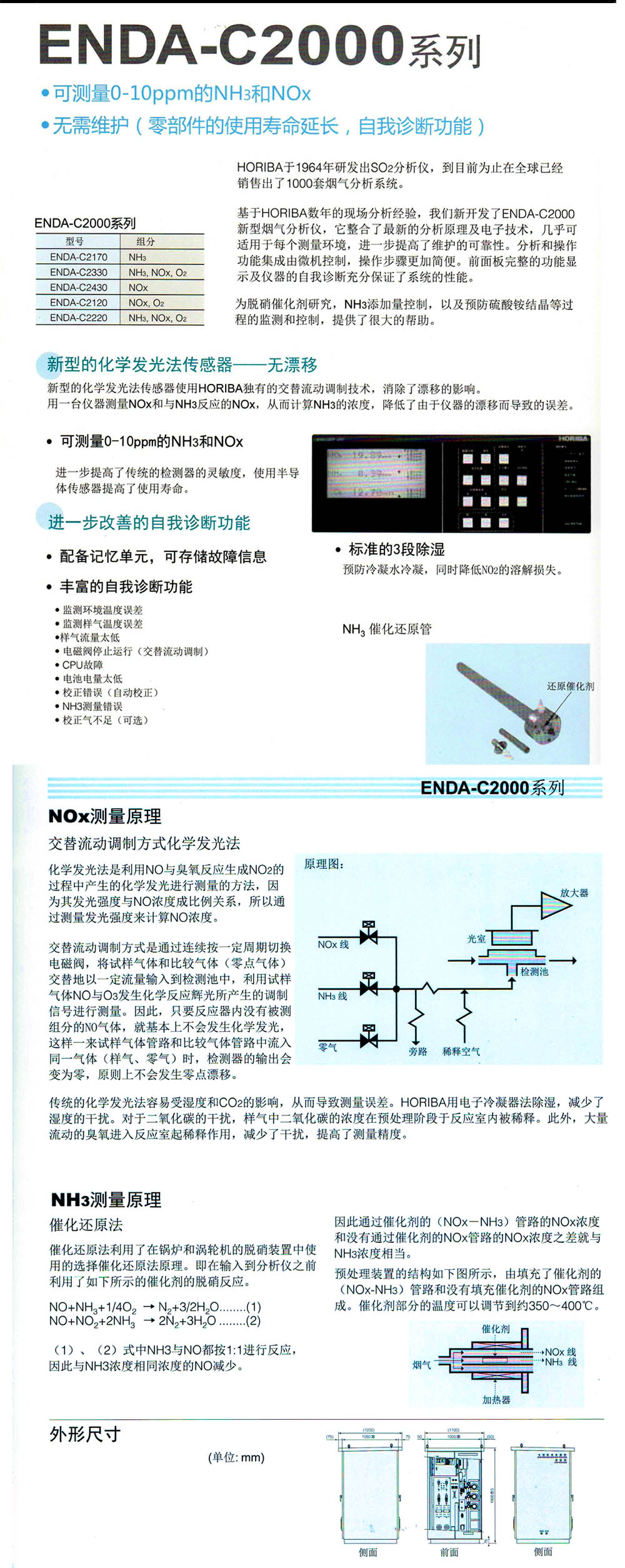 它可以對氨干式脫硝裝置排放出來的尾氣中的殘留NH3濃度進行連續檢測。采用了無漂移新型化學發光法分析儀(CLA),檢測器實現了高度化。并且,由于使用了半導體傳感器,所以工作奉命長。分析部和操作部的功能集中統一,采用了在前面進行操作方式,并且完善了自我診斷功能等,力求使用便利??杀O測脫硝催化劑的劣下、限制NH3的注入量、防止硫酸銨結晶物的生成等,在設備的監測、控制方面可以發揮出威力 。